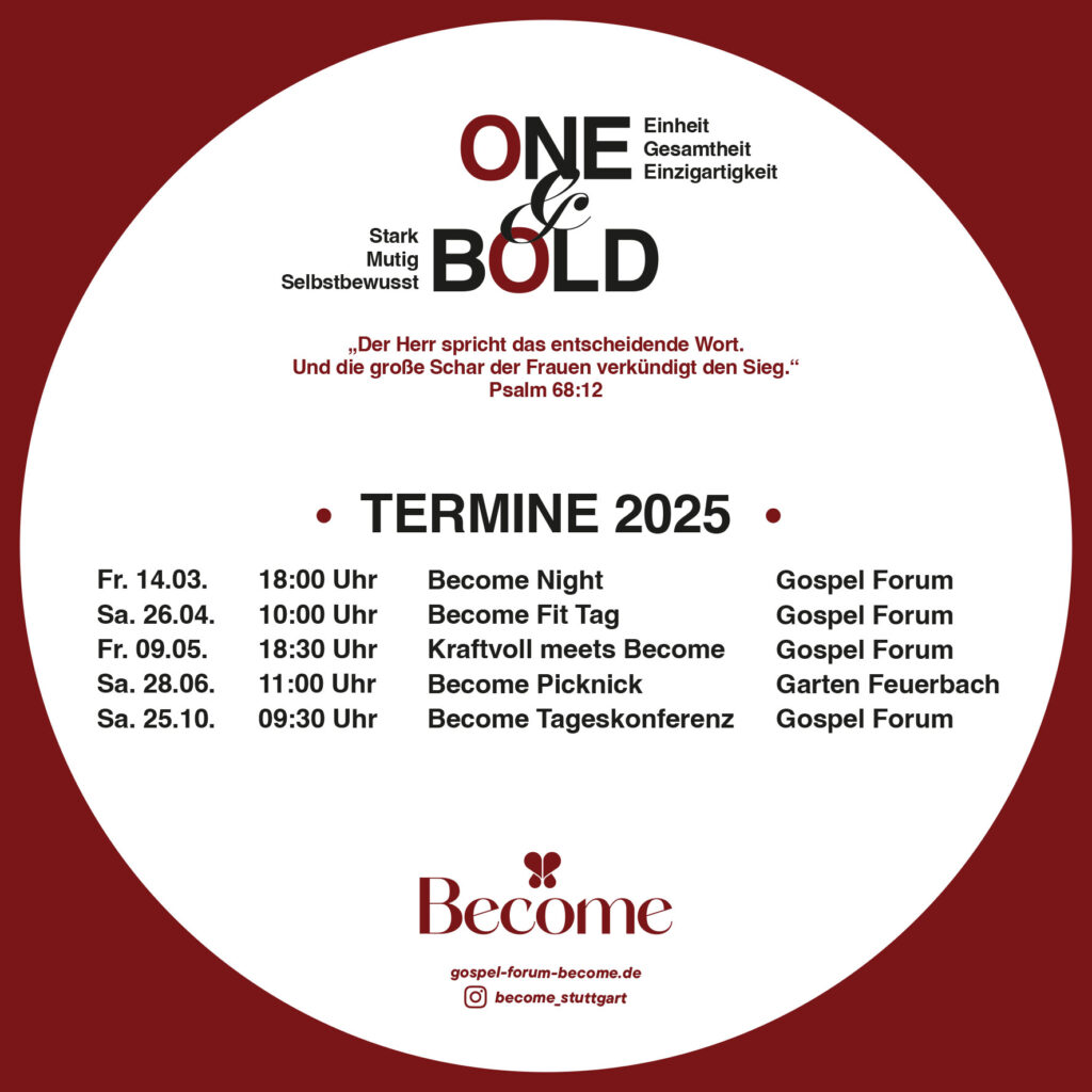 Das Become Gathering ist unser jährliches Konferenz, wo wir für zwei Tage zusammenkommen, um geistlich gestärkt zu werden, Gemeinschaft zu erleben und in unserer Berufung zu wachsen.